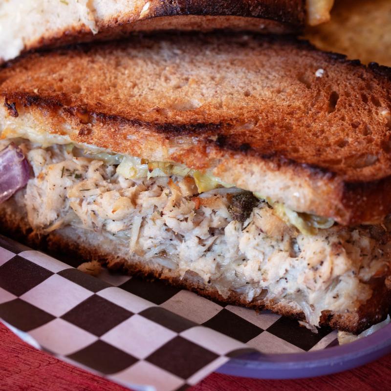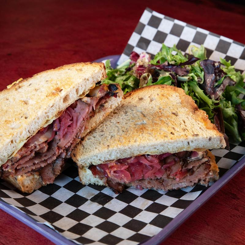 Peppered pastrami, Swiss, dijon, house pickled red cabbage, 1000 Island baked on rye. Veggie option: Jack Fruit.