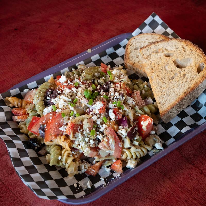 Rotini pasta, tomato, red onion, red pepper, artichoke heart, Kalamata, feta. Choice of house vinaigrette or pesto. Bread / Butter.