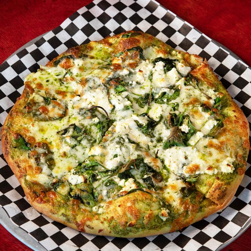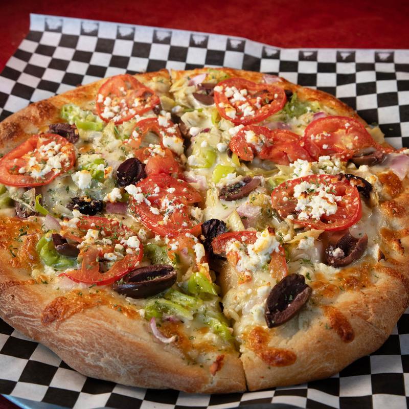 House garlic-chili oil, mozzarella, red onion, Kalamata, artichoke, pepperoncini, feta, tomato.