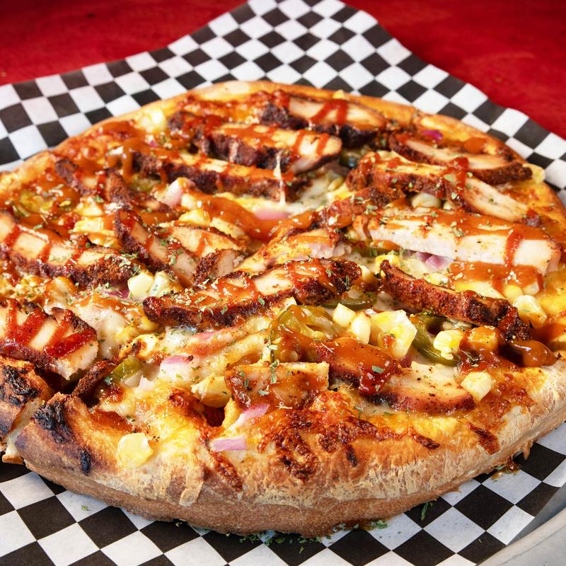 House BBQ sauce, mozzarella, house smoked chicken, red onion, sweet corn, house pickled jalapeno, BBQ sauce drizzle.