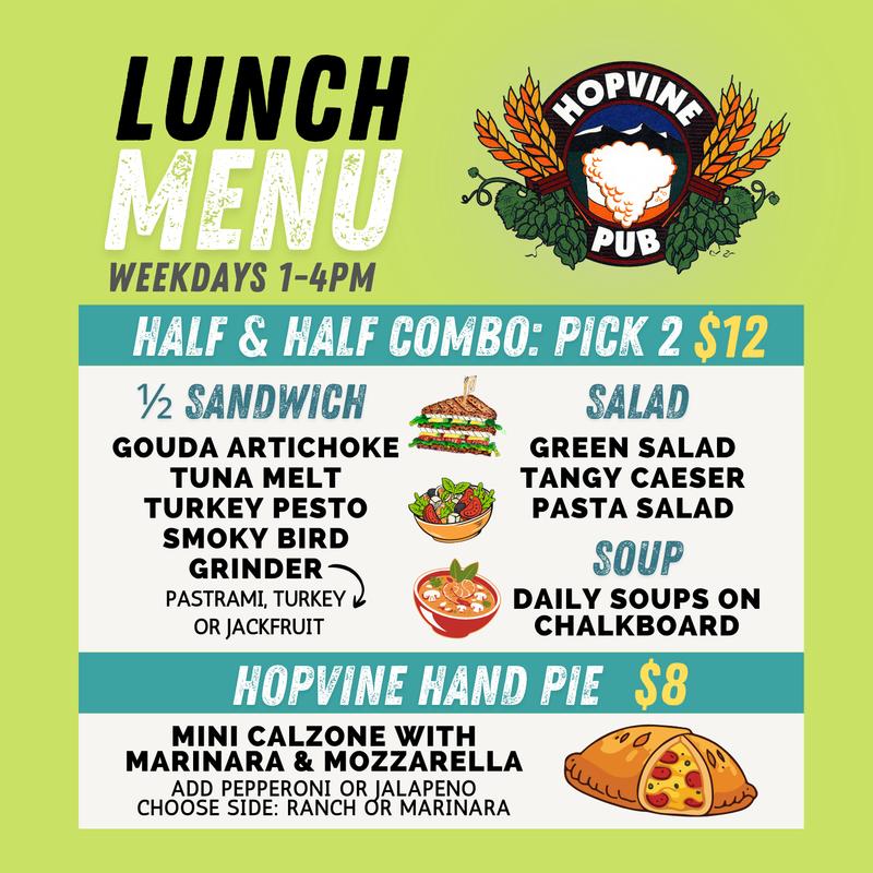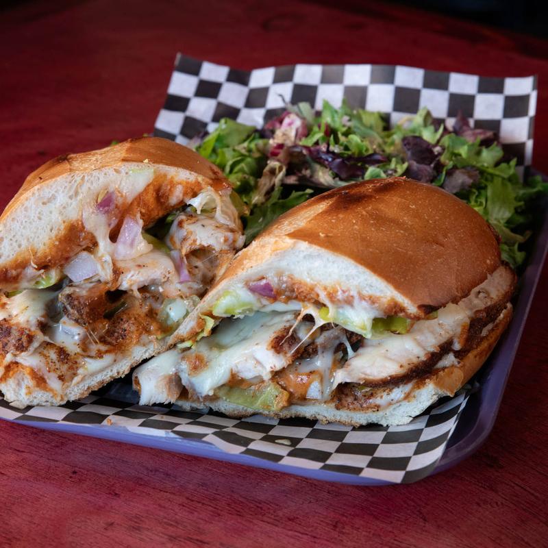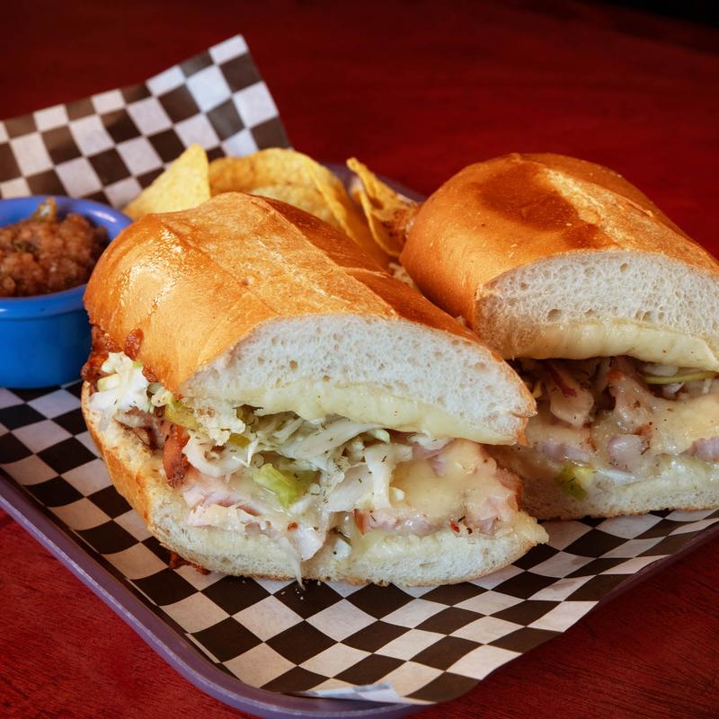 Choose: pastrami, house smoked turkey or chipotle jack fruit; mayo, mozzarella, house relish (cabbage, red onion, pickle, dill, pepperoncini) baked on french roll. Half & Soup Cup $14.00