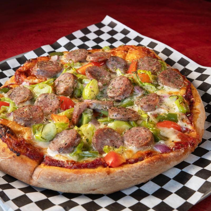 House marinara, mozzarella, Italian sausage, red onion, red & green bell pepper, pepperoncini.