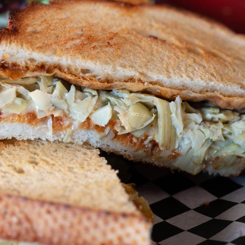 Ancho pepper spread, gouda, artichoke heart, baked on sourdough. Half & Soup Cup $13.00