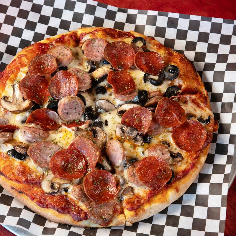 House marinara, mozzarella, pepperoni, Italian sausage, black olive, mushroom.