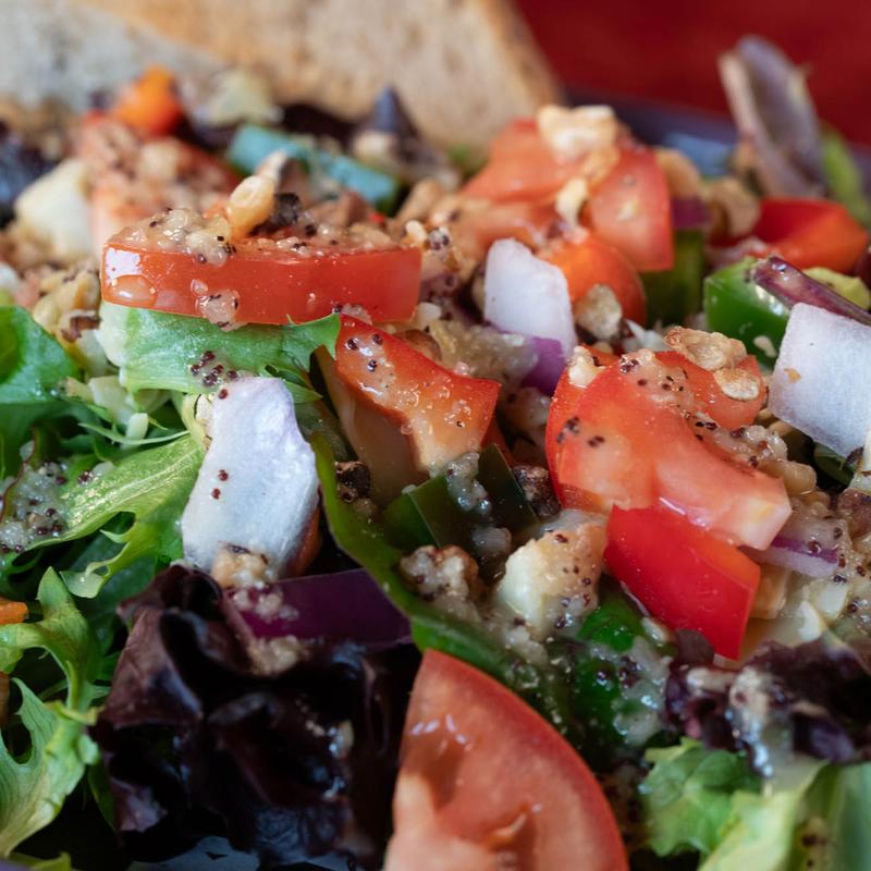 Mixed greens, tomato, red onion, red & green bell pepper, artichoke heart, walnut. House dressing: vinaigrette, blue cheese, ranch. Bread / Butter.